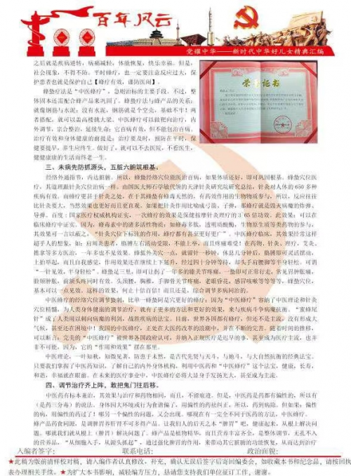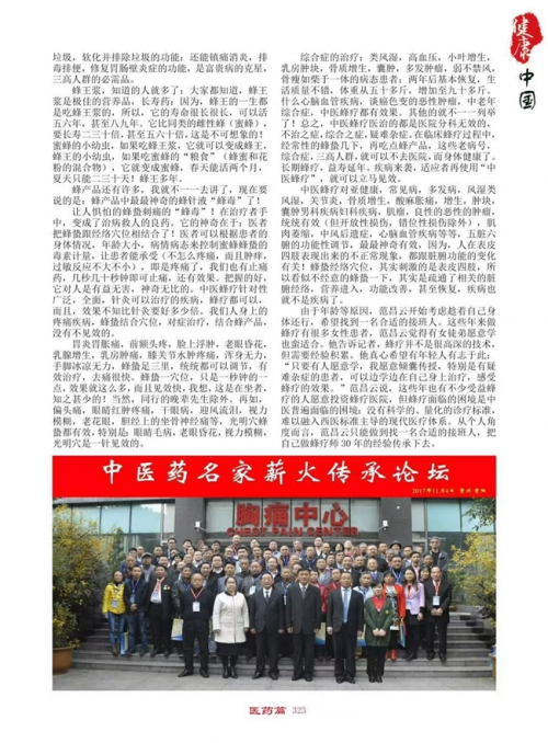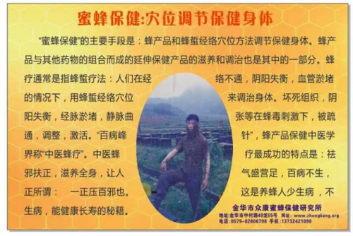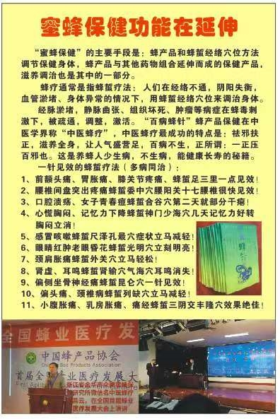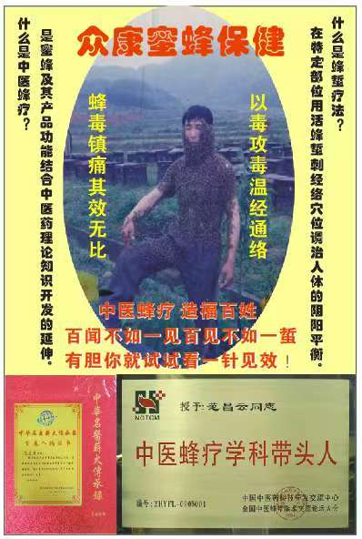 中医蜂疗;包括蜂产品保健和蜂蛰经络穴位治疗方法结合,内服外疗,能内外兼治,多病同治,整体调节,百病药效。如果合理运用,中医蜂疗可与任何有以利于身体健康的其它方法互补互动而增加疗效。蜂蛰一穴,结合推拿经络疏通激活方法,即可达到快速祛除身体病痛。是人民群众最经济实惠,最接地气的健康生存和疾病逆转治疗方法!它更不排斥现代科学仪器和符合人体调节的健康药物与方法。
