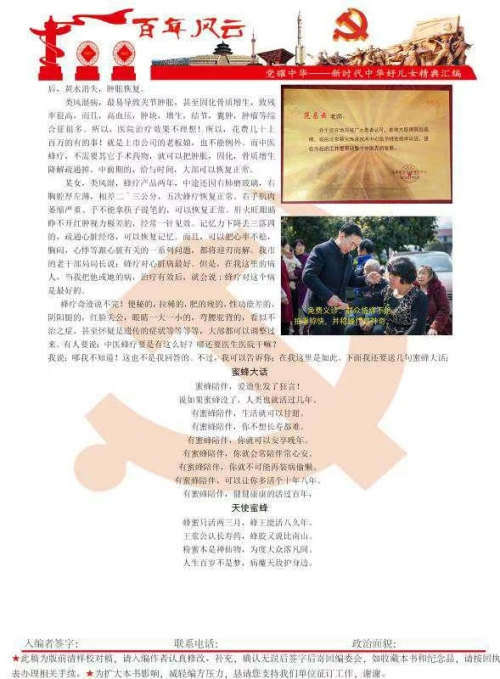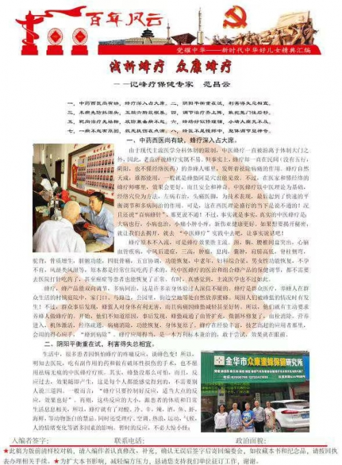 真希望有识之士一起来研究开发和发展中医蜂疗,国家来重视疗中医蜂疗。中医蜂疗如果能在全国开展,哪对国家社会和所有的老百姓,都会带来无穷尽的好处。这一简单而奇特的人类生命医疗,不仅简单而又价廉物美,它更符合全体人民群众的医疗。不过它与医疗利益集团格格不入!自私的资本集团,为了自己的一点小利益,就一定会打压蜜蜂医疗。可国人有幸!我们的中央集体领导在为民造福,在进一步开放民间中医,让闭门造车的医疗领域,又多出了一个奇葩的蜜蜂医疗奇芳异草。