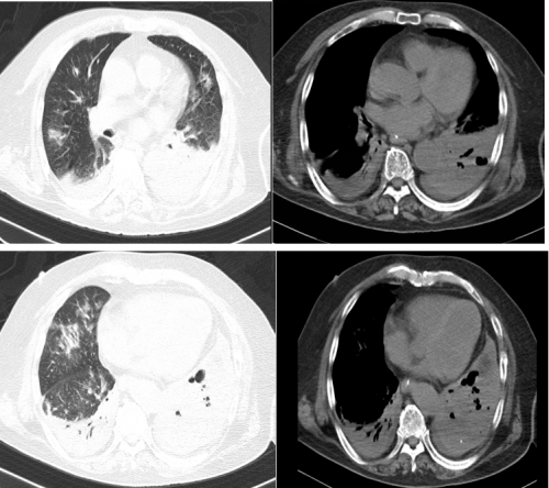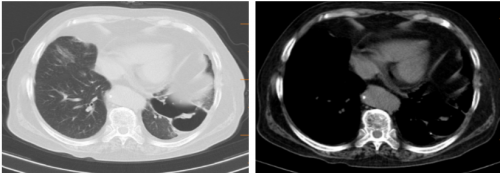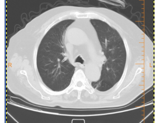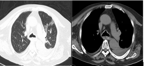 患者2年前活动后胸闷气短,活动后加重,自诉无喘息及拉弦,无胸痛,自行服用速效救心丸好转,未在意,未系统诊治。5天前胸闷气短较前明显加重,伴发热,未测体温,咳嗽咳痰,痰量约20-30口,为黄色脓痰,就诊当地中医医院查胸部CT 左肺下叶炎性改变,左肺下叶支气管阻塞,双肺多发结节,左侧胸腔少量积液,住院期间静点抗生素治疗,患者症状不缓解,来我院急诊。