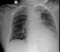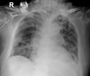 端坐呼吸,口唇发绀;双肺听诊呼吸音粗,双肺闻及干湿啰音。双下肢无水肿。